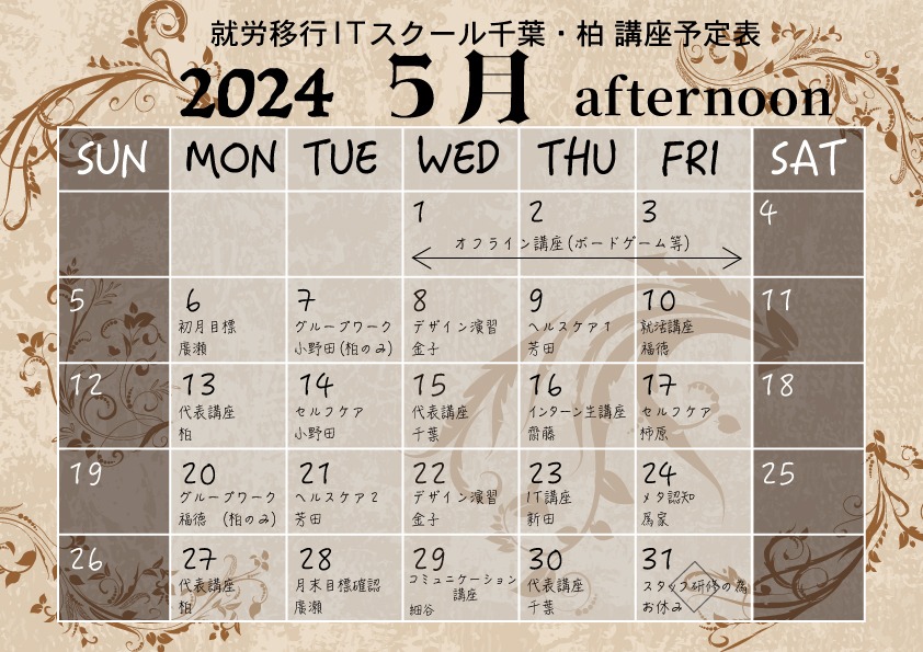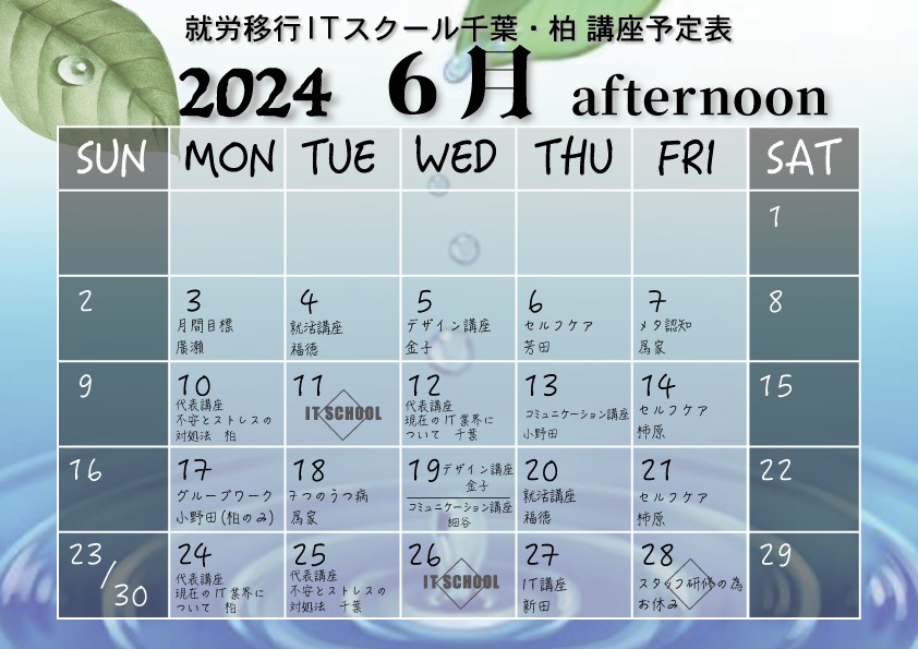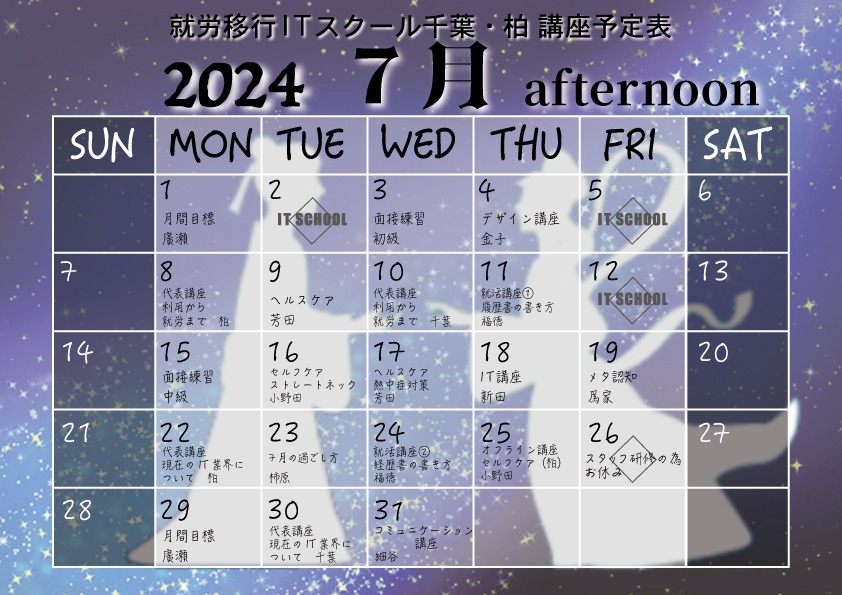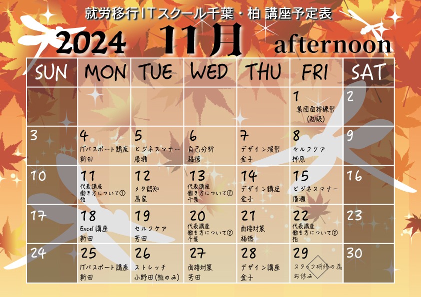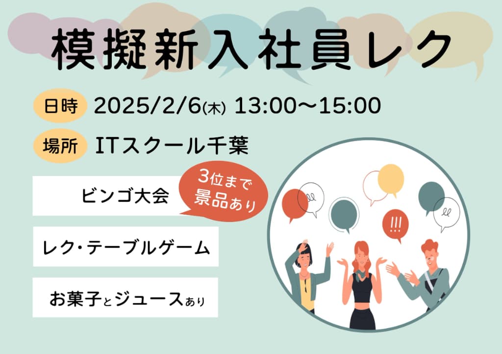| 2025/1/7 | 【イベントのお知らせ】2月6日(木)13:00より、ITスクール千葉事業所にて模擬新入社員レクを開催いたします。是非ご参加ください! |
