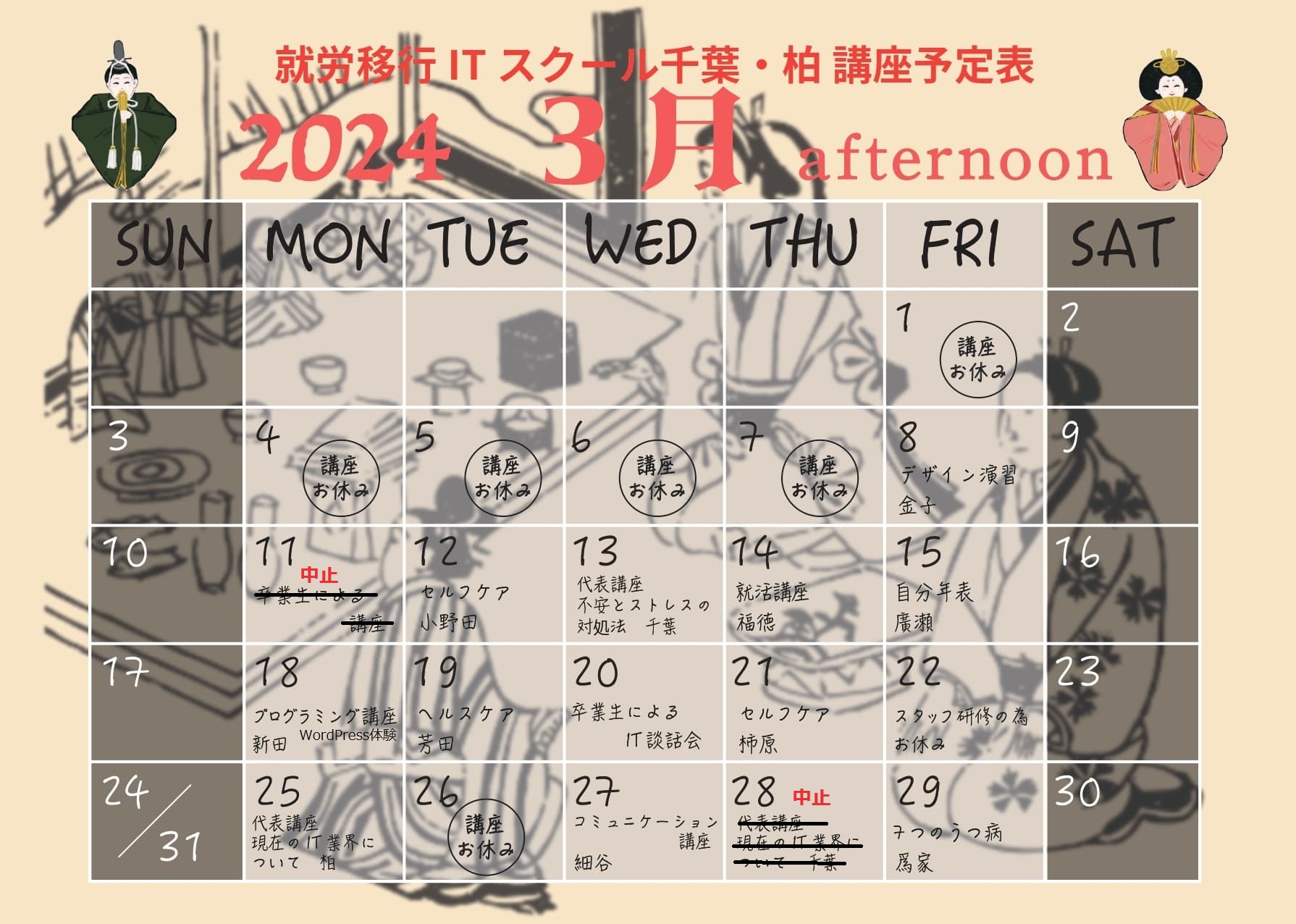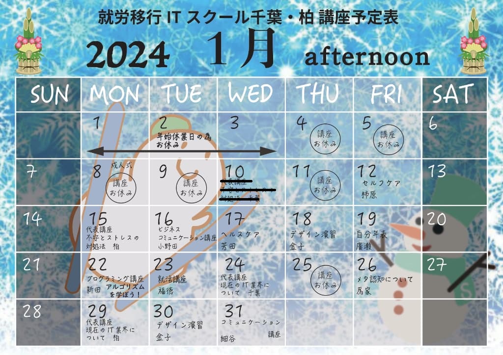 | 2025/1/15 | 【講座の日程変更のお知らせ】1月15日(水)の代表講座(千葉事業所)は、1月30日(木)の11時からに変更となります。※1月30日(木)開催予定のデザイン講座は、通常通り13時より行われます。 |