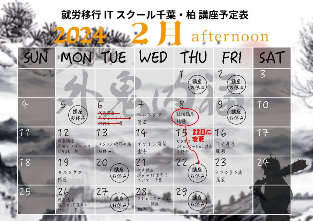 | 2024/1/31 | 講座ページに2月の講座予定表を掲載しました。 |
